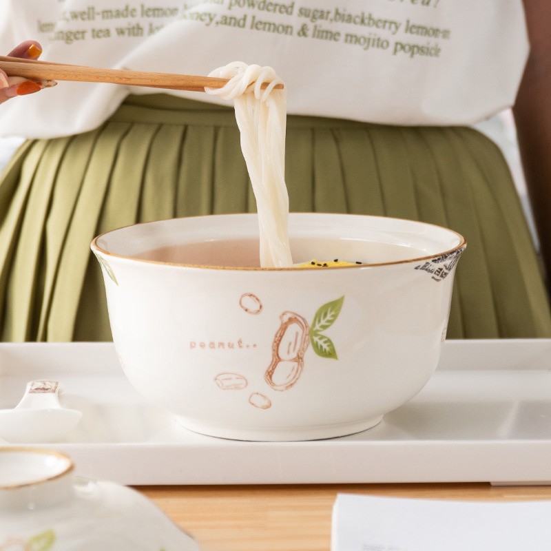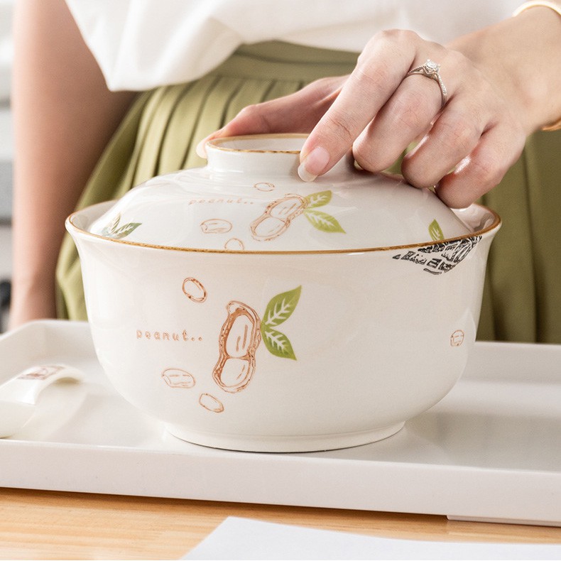 Giới thiệu Bát sứ ăn mì có nắp họa tiết dứa, tem thư, củ lạc dễ thương