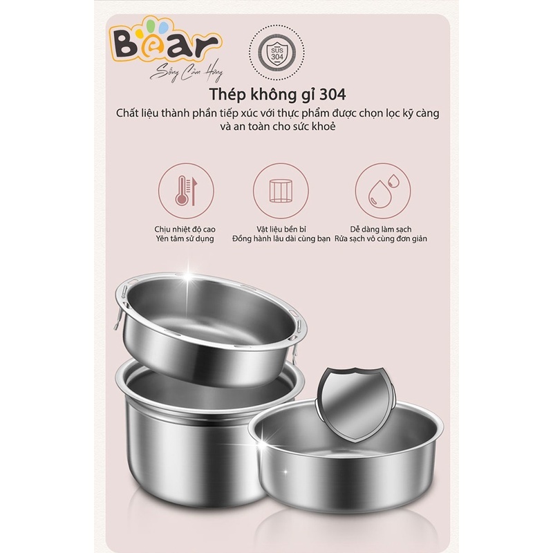 Hộp Cơm Cắm Điện Dung Tích 2.0 lít Gồm 3 Tầng Inox Công Suất 270W Màu Hồng Nhạt - BẢN QUỐC TẾ chính hãng Bear DFH-B20S6