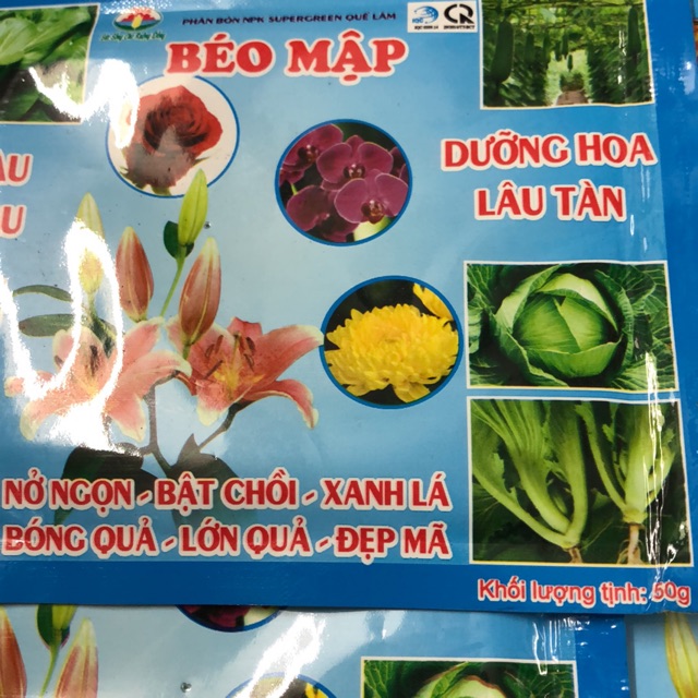 Phân bón NPK Béo Mập đẹp màu, tươi lâu, dưỡng hoa lâu tàn gói 50 gram ☘️Phân bón NPK Béo Mập là sản phẩm phân bón NPK Quế Lâm tốt cho cây có hoa, ăn lá, lấy quả với tác dụng nở ngọn, bật chồi, xanh lá, bóng quả, lớn trái, đẹp mã.