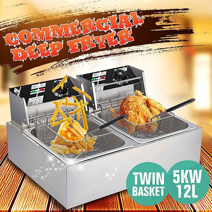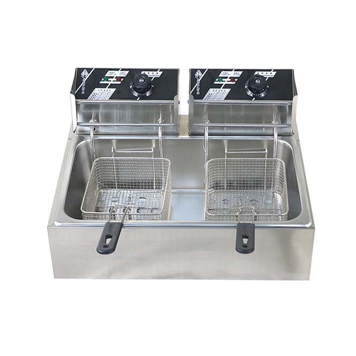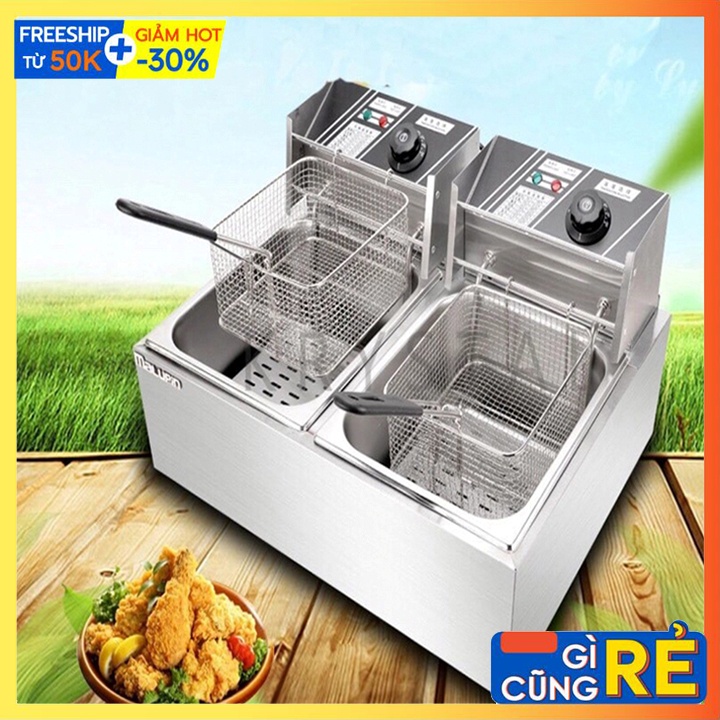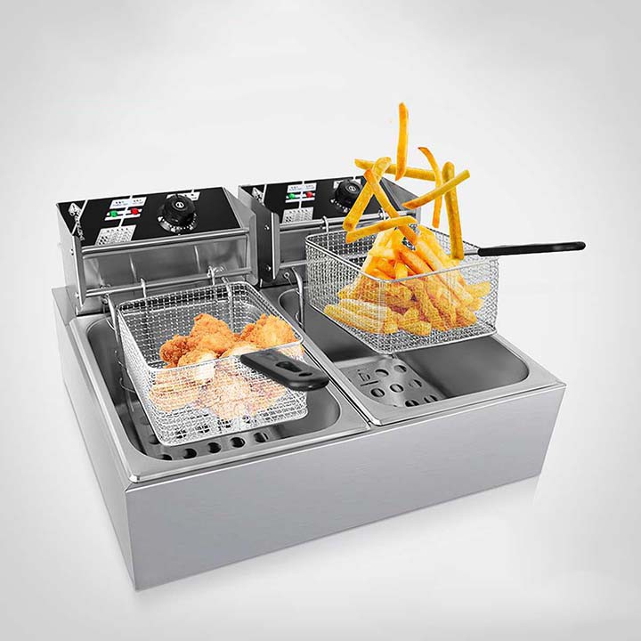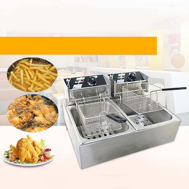 – Bếp chiên nhúng điện đôi 2 giỏ 6X2 lít: bếp chiên khoai tây, chiên gà, đùi gà, cánh gà, xúc xích, thịt bò... Bếp chiên đa năng thiết kế bằng inox không rỉ, có thể tháo rời dễ dàng thuận lợi cho vệ sinh.