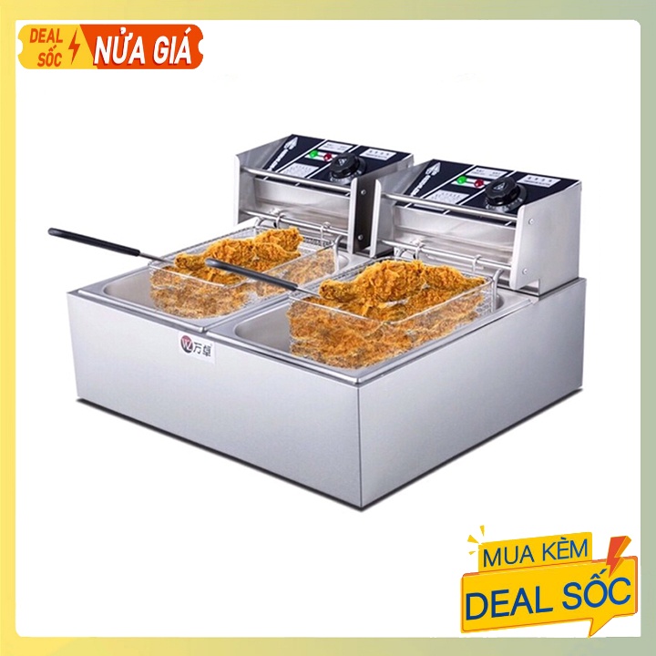– Bếp chiên nhúng điện đôi 2 giỏ 6X2 lít: bếp chiên khoai tây, chiên gà, đùi gà, cánh gà, xúc xích, thịt bò... Bếp chiên đa năng thiết kế bằng inox không rỉ, có thể tháo rời dễ dàng thuận lợi cho vệ sinh.