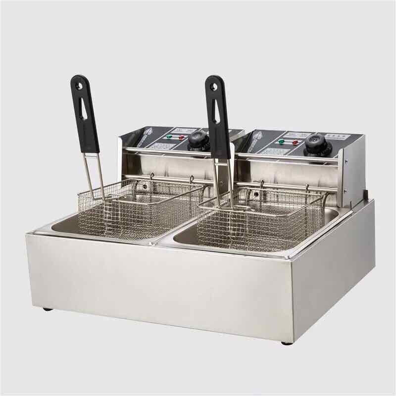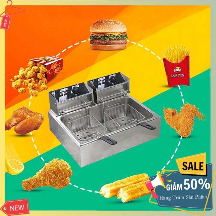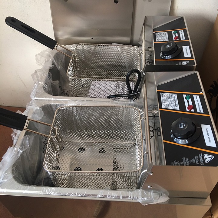 – Bếp chiên nhúng điện đôi 2 giỏ 6X2 lít: bếp chiên khoai tây, chiên gà, đùi gà, cánh gà, xúc xích, thịt bò... Bếp chiên đa năng thiết kế bằng inox không rỉ, có thể tháo rời dễ dàng thuận lợi cho vệ sinh.