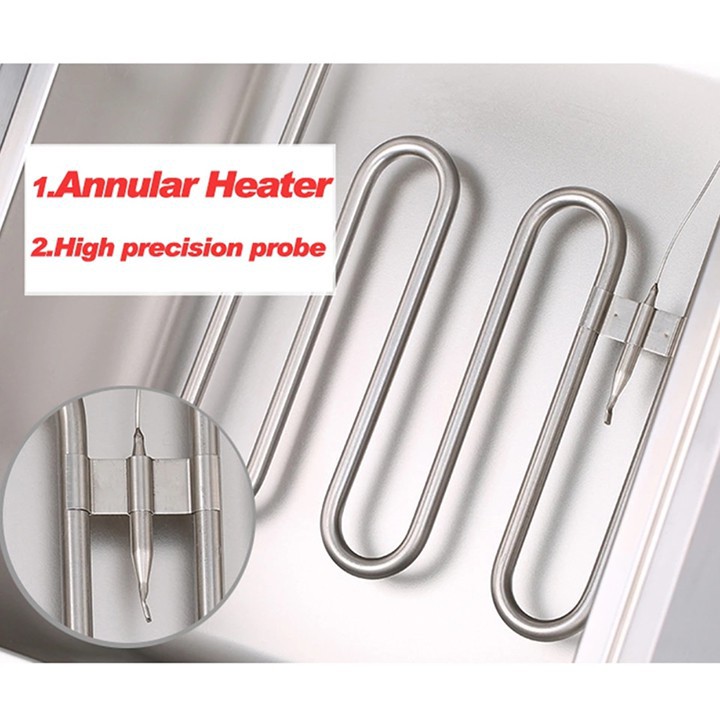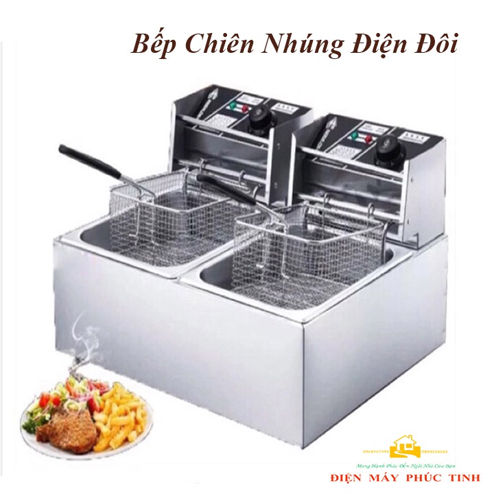 – Bếp chiên nhúng điện đôi 2 giỏ 6X2 lít: bếp chiên khoai tây, chiên gà, đùi gà, cánh gà, xúc xích, thịt bò... Bếp chiên đa năng thiết kế bằng inox không rỉ, có thể tháo rời dễ dàng thuận lợi cho vệ sinh.