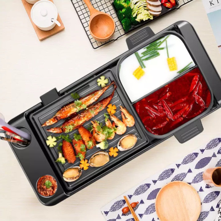 Bếp lẩu kiêm nướng 2 trong 1 cao cấp chống dính, phủ Teflon, khay tháo rời tiện dụng, 2200W, BBQ hot pot grillCòn gì tuyệt vời hơn khi được cùng gia đình, bạn bè ngồi quây quần bên nhau và thưởng thức lẩu và nướng.Tuy nhiên để chế biến hai món đó lại mất khá nhiều thời gian và công sức. Hiểu được nhu cầu đó các nhà sản xuất đã cho ra đời sản phẩm bếp lẩu nướng hai trong một với nồi lẩu 2 ngăn. Một thiết bị tích hợp hai tính năng, bạn có thế vừ nấu lẩu vừa làm đồ nướng.