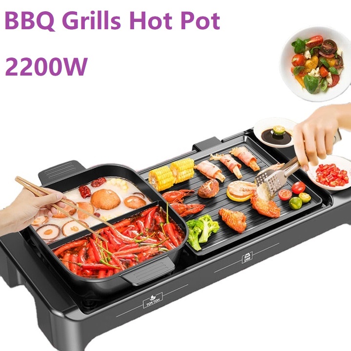 Bếp lẩu kiêm nướng 2 trong 1 cao cấp chống dính, phủ Teflon, khay tháo rời tiện dụng, 2200W, BBQ hot pot grill
