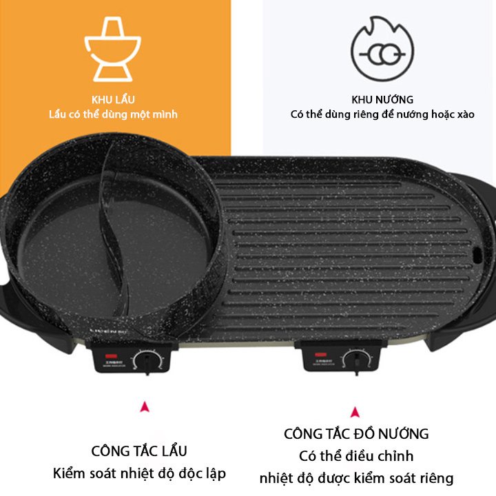 ✔️ Tiết kiệm điện với 2 núm điều chỉnh nhiệt độ cho nồi lẩu và bếp nướng