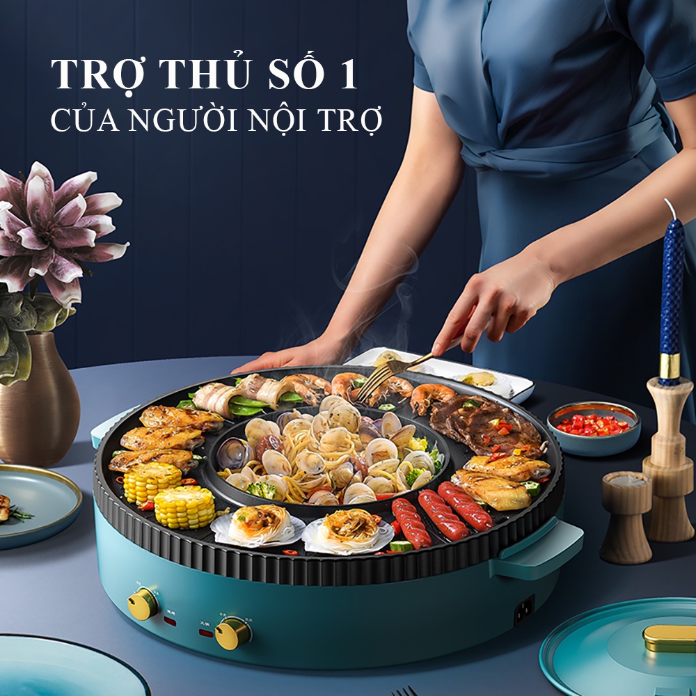 🍀 Bếp lẩu nướng đa năng bề mặt chống dính tiện lợi thông minh, Bếp lẩu nướng 2 in 1 phù hợp từ 5 đến 8 người ăn