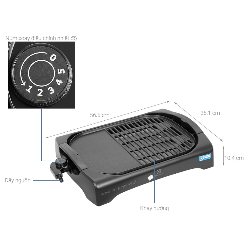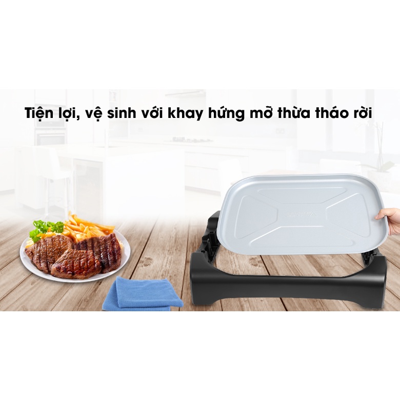 Tiện ích: Bề mặt nấu nướng tiện lợi. Khay hứng mỡ thừa. Vỉ nướng có thể tháo rời