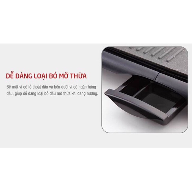 - Viền mặt trước và mặt sau được làm bằng thép không gỉ, hai bên tay cầm được làm bằng nhựa chống nóng hiệu quả, đảm bảo an toàn khi sử dụng. Vỉ nướng được phủ lớp chống dính chất lượng cao nhập khẩu từ Nhật Bản, không có chứa chất độc hại PFOA, tiết kiệm thời gian khi chùi rửa.