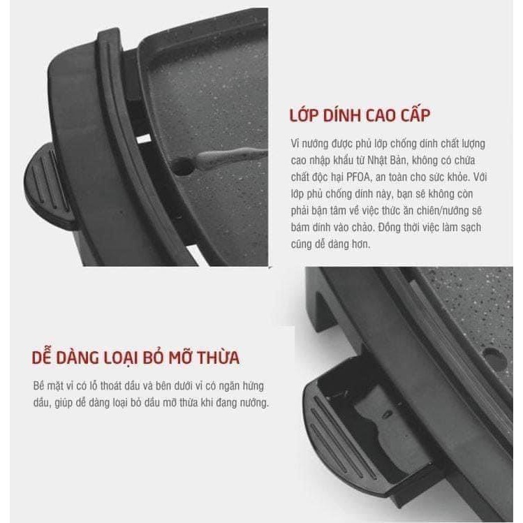- Vỉ nướng được phủ lớp chống dính chất lượng cao nhập khẩu từ Nhật Bản, không có chứa chất độc hại PFOA, an toàn cho sức khỏe, đồng thời cũng tiết kiệm thời gian khi chùi rửa.