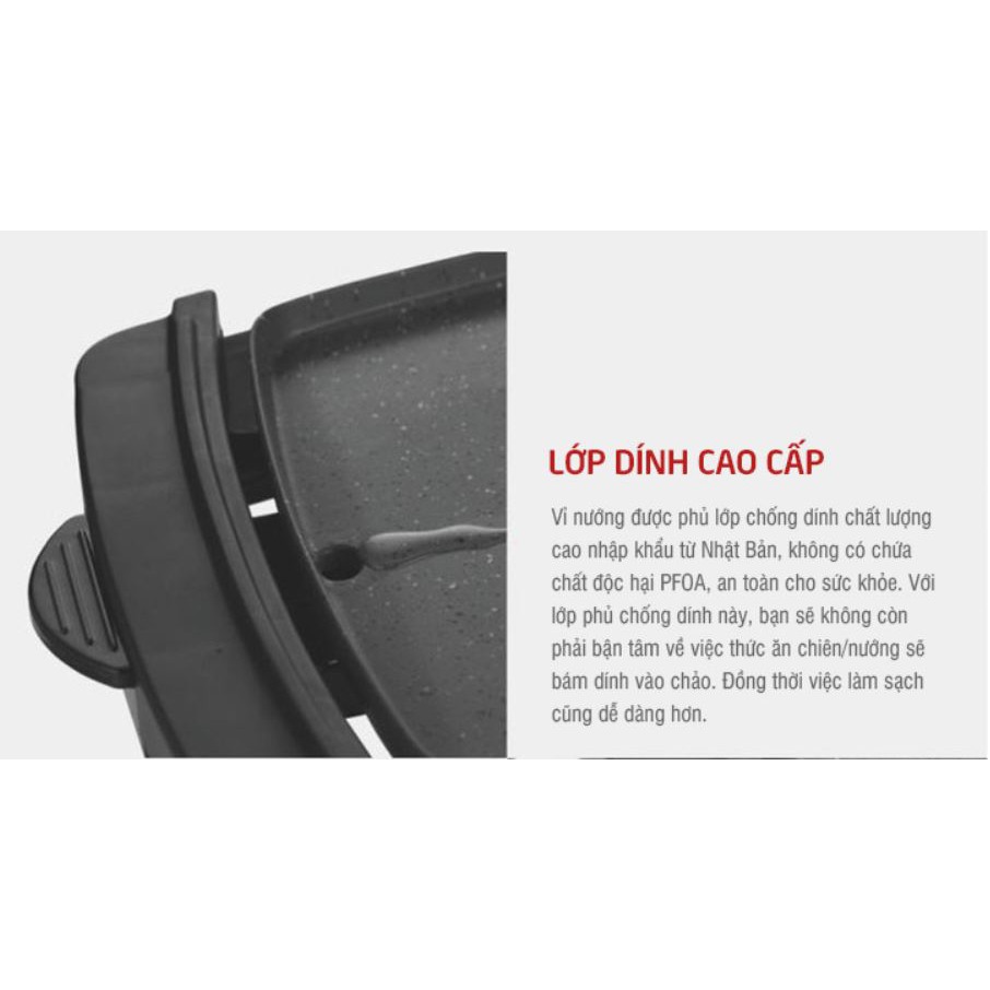 Viền mặt trước và mặt sau được làm bằng thép không gỉ, hai bên tay cầm được làm bằng nhựa chống nóng hiệu quả, đảm bảo an toàn khi sử dụng. Bếp nướng được phủ lớp chống dính chất lượng cao nhập khẩu từ Nhật Bản, không có chứa chất độc hại PFOA, tiết kiệm thời gian khi chùi rửa.