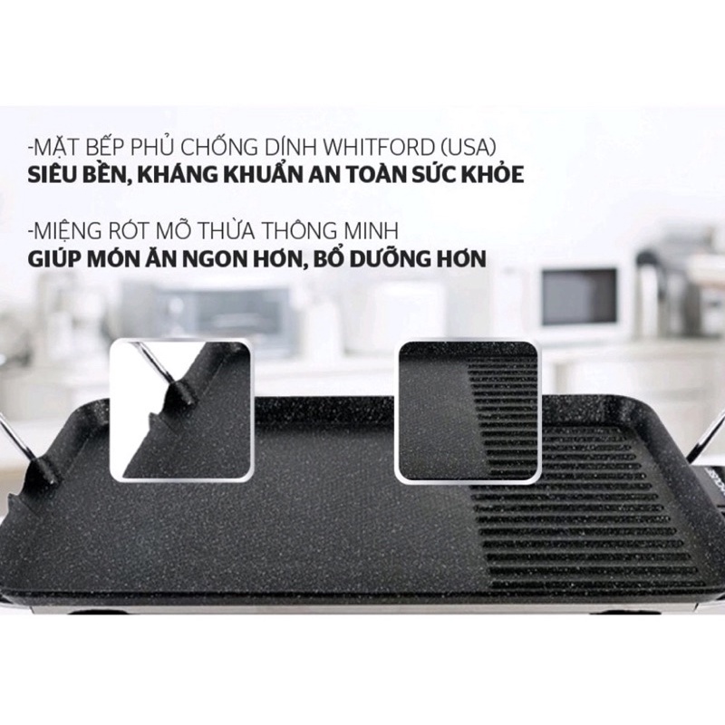 - Mặt bếp/Khay nướng: Chống dính Whitford (USA) phủ đá hoa cương