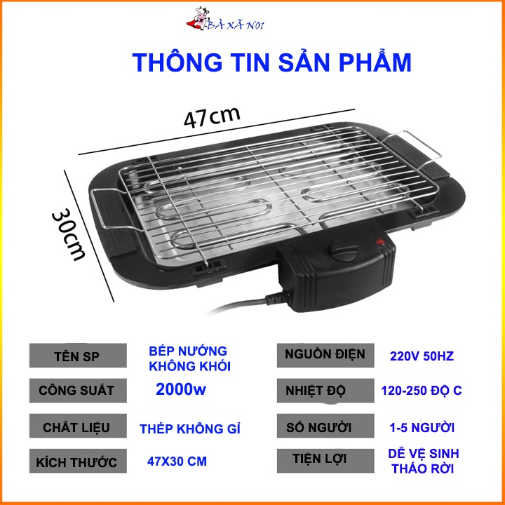 ử dụng bếp nướng có ưu thế là mọi người quây quần bên nhau và cùng nướng các loại thức ăn theo sở thích của từng người. Vì vậy, giá trị của các loại bếp này ngoài việc căn cứ vào độ an toàn thiết bị còn căn cứ vào khả năng không phát sinh khói gây ảnh hưởng đến sức khỏe người sử dụng. Điểm cải tiến của Bếp nướng không khói Electric barbecue grill 2000W so với các loại bếp nướng khác là điện trở có công tắc an toàn. Công tắc chỉ bật khi cụm điện trở được lắp vào bếp. Khi để bên ngoài dù có cắm điện, cụm điện trở cũng không dẫn điện và vì thế không gây nguy hiểm, nhất là cho trẻ em. Ngoài ra, dù với công suất 2000W- 220V điện trở giúp cho người tiêu dùng tiết kiệm điện.