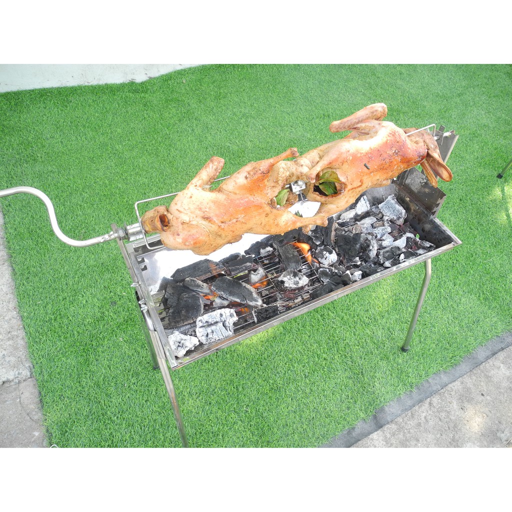 - Sản phẩm bao gồm: 1 thân bếp, 1 vỉ than, 1 vỉ nướng. 2 chân đứng, 1 gắp than,2 tấm thay đổi chiều cao vỉ + bộ xiên quay tay