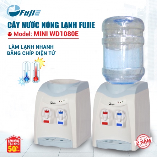 Cây Nước Nóng Lạnh Để Bàn Mini FujiE WD1080E - Thương hiệu đến từ Nhật Bản , với phương pháp làm lạnh bằng Chip điện tử được sản xuất chuyên dùng để phục vụ cho nhu cầu ăn uống, sử dụng nước nóng, nước lạnh thuận tiện và nhanh chóng cho tất cả mọi người; là một sản phẩm không thể thiếu trong các cơ quan, văn phòng công ty, bệnh viện, khách sạn... cho tới các hộ gia đình. Với công nghệ hiện đại từ Nhật Bản, thiết kế tinh tế, đa dạng về mẫu mã, màu sắc; Cây nước nóng lạnh Fujie là sự lựa chọn tối ưu, mang đến sự an tâm về uy tín, chất lượng, luôn nhận được sự quan tâm và tin dùng của rất nhiều khách hàng.Cây Nước Nóng Lạnh Để Bàn Mini FujiE WD1080E có Thiết kế sang trọng với lớp vỏ màu trắng bóng tuyệt đẹp, phần trên cùng là vị trí đặt bình nước, Sản phẩm mới ra mắt 2019 với mức giá rẻ nhất trong các dòng cây nước để bàn cùng loại, tuy nhiên FujiE WD1080E vẫn đảm bảo chất lượng bền bỉ vượt trội được đảm bảo mới thương hiệu Fujie uy tín lâu đời tại Việt Nam. . Đây là mẫu cây nước nóng lạnh bán chạy nhất trên thị trường hiện nay, Rất được các gia đình và văn phòng mua sử dụng