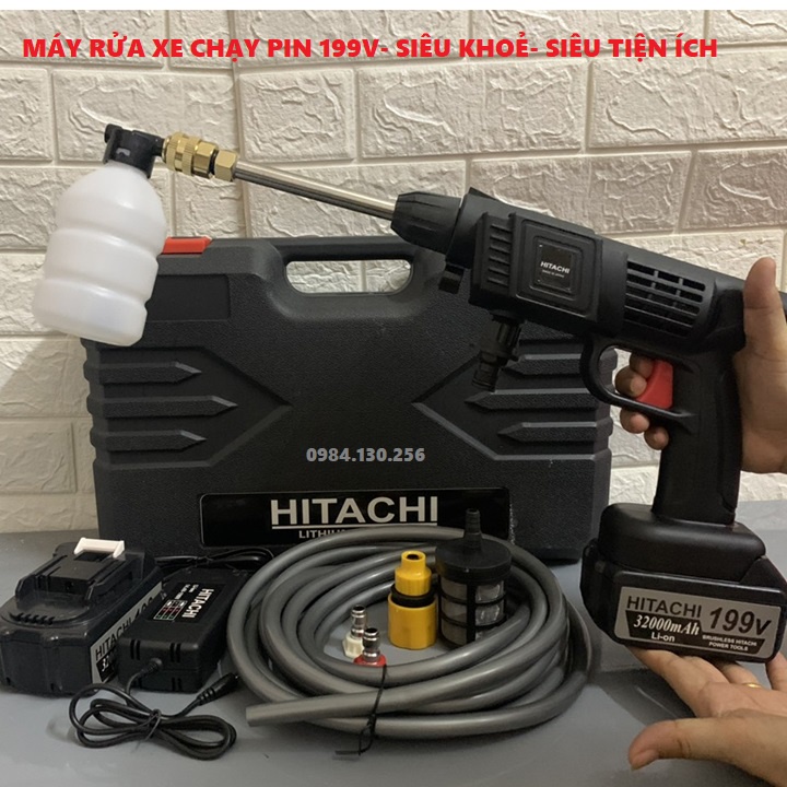 [BH1NĂM] Máy rửa xe dùng pin mini, Máy xịt rửa tăng áp Hitachi 199V áp lực cao 1400W