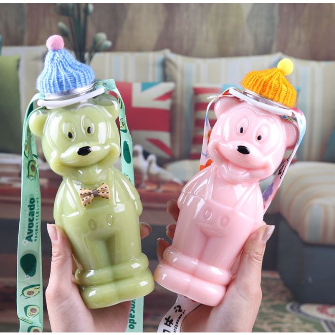 Bình chai nhựa PET hình chuột Mickey đeo nơ đựng trà sữa, nước ép hoa quả 400ml có nắp đậy bằng nhôm và dây đeo, mũ len