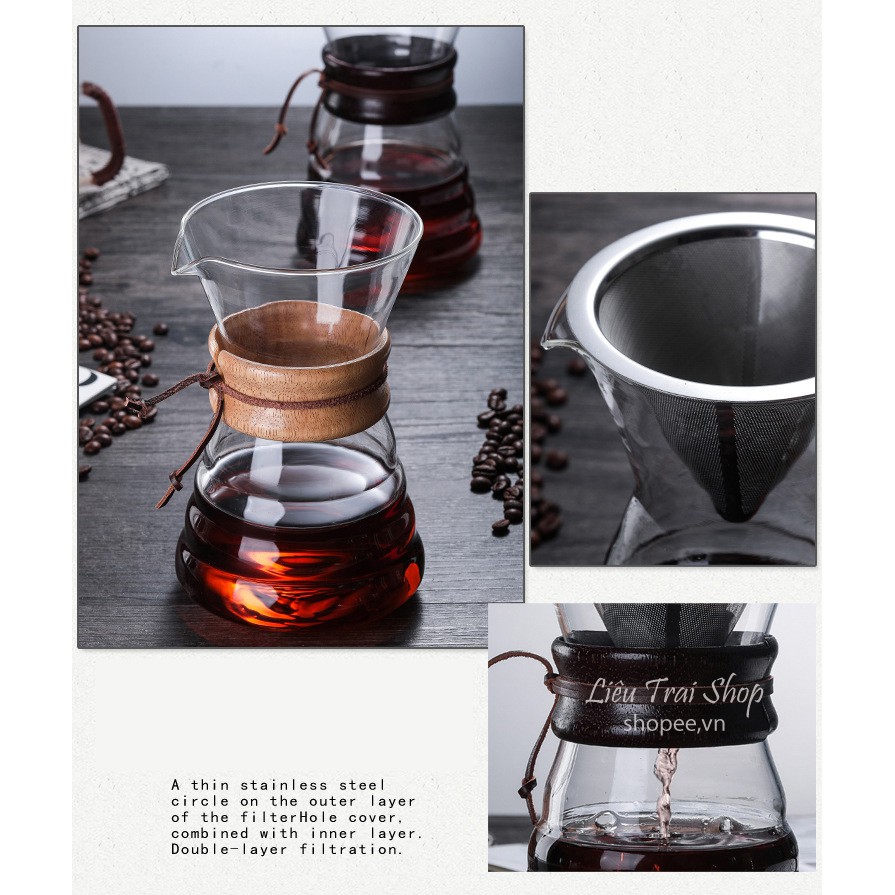 Bình chemex pha cà phê pour over drip brew v60 thủy tinh 500mlBộ sản phẩm gồm bình và phễu lọc inox