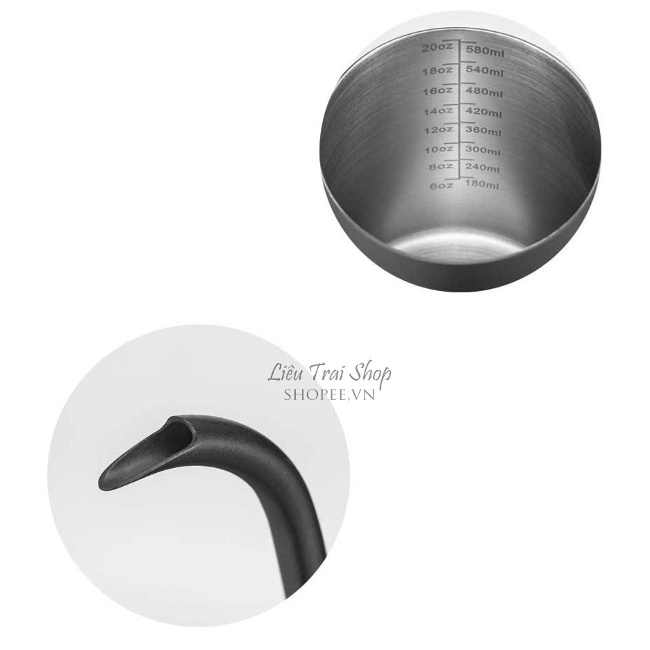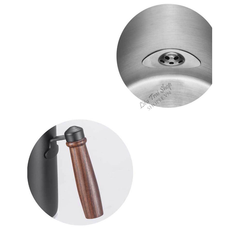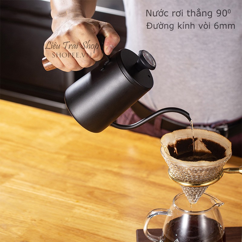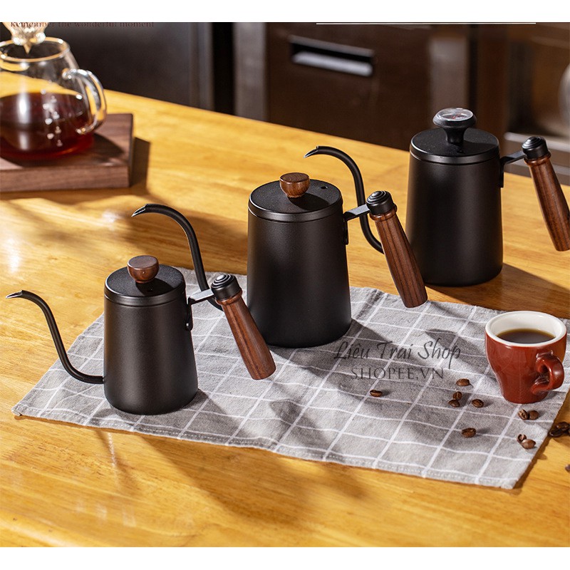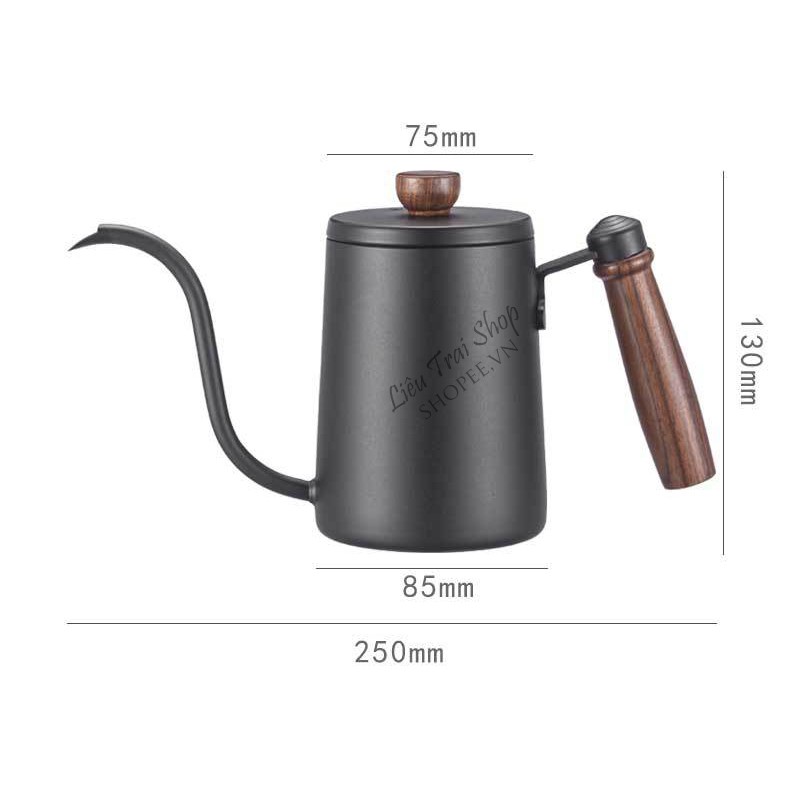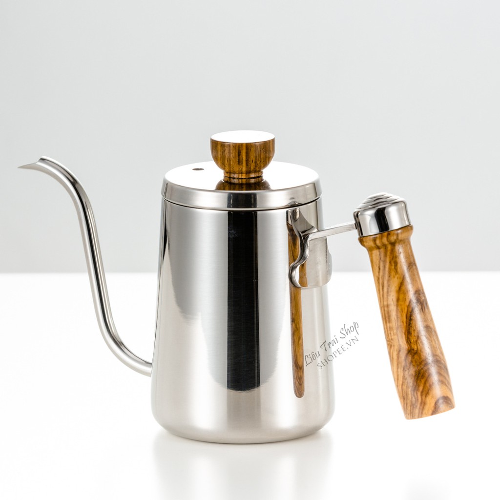 Ấm cổ ngỗng chuyên dùng rót nước pha cà phê, như pour over, cà phê túi lọc, chemex , drip. Ấm có dung tích 600ml, cân nặng 390gram, được làm từ inox 304 chuyên dùng thực phẩm.Tay cầm bằng gỗ, núm nắp bằng gỗ hoặc tích hợp nhiệt kế, bên trong có vạch chia dung tích.