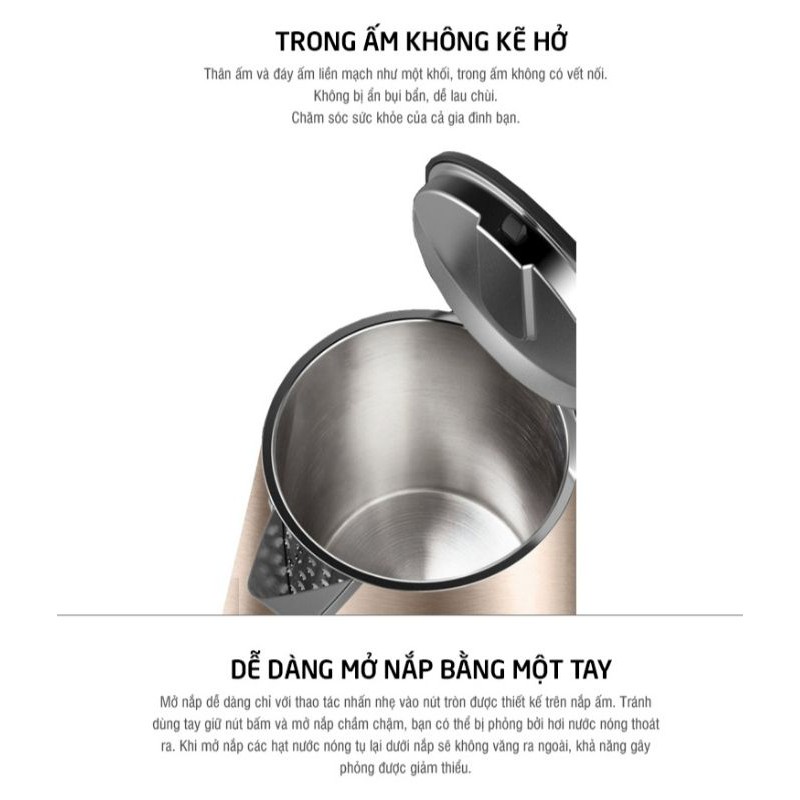 Được thiết kế thân làm bằng thép không gỉ, an toàn cho sức khỏe. Thiết kế kiểu dáng đẹp, tay cầm nhựa PP cách nhiệt tiện di chuyển, miệng ấm lớn dễ dàng châm nước