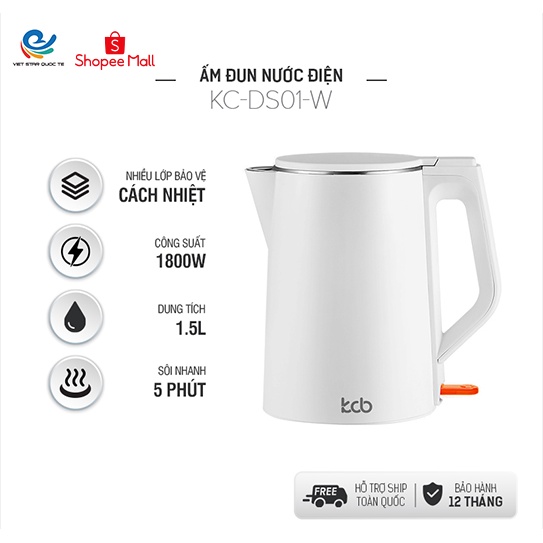 Giới thiệu Bình đun siêu tốc, ấm đun nước điện KC-DS01-W, công suất 1800W, dung tích 1.5L,thép không gỉ, bảo hành 12 tháng