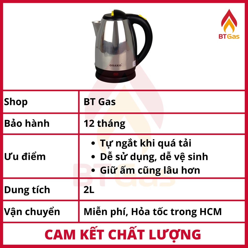 Bình đun siêu tốc, ấm siêu tốc bền đẹp, nấu nước an toàn, thân ấm inox dung tích 2 lít Osako OSA-206