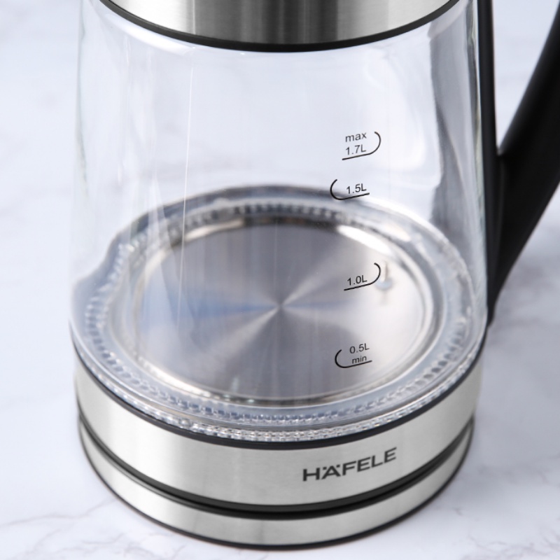 - Bình đun siêu tốc Hafele thiết kế sang trọng, thanh lịch với chất liệu bình bằng thủy tinh trong suốt chịu nhiệt tốt.