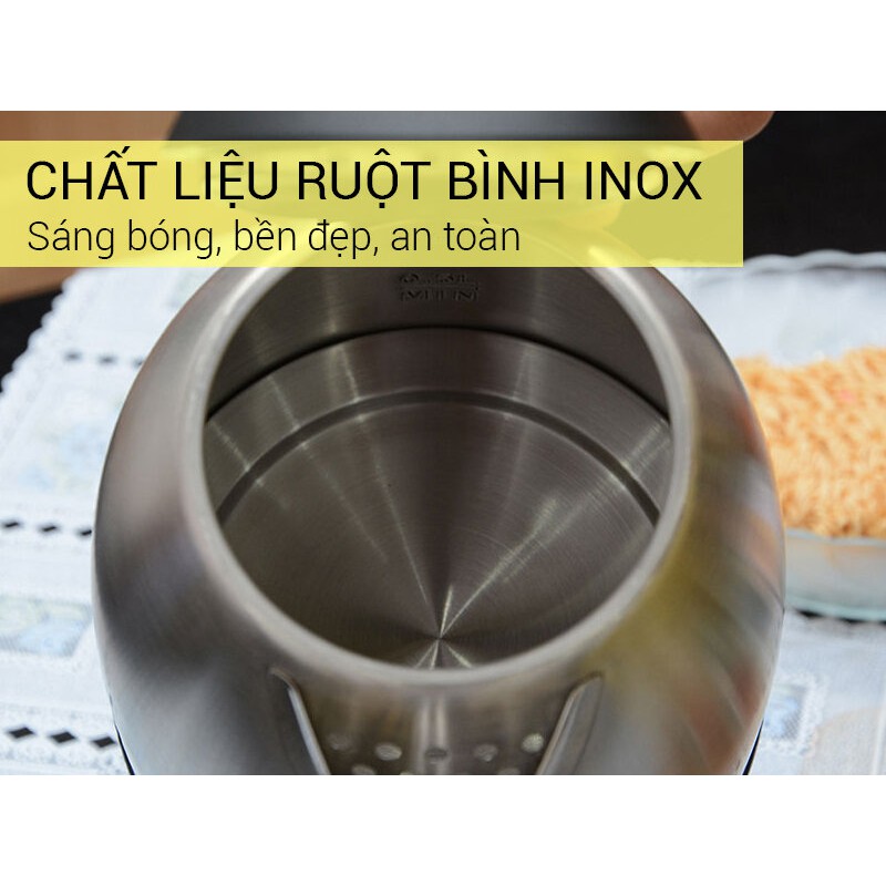 Ruột bình làm bằng chất liệu inox cao cấp cho khả năng đun sôi nhanh và an toàn vệ sinh. Bên cạnh đó, sản phẩm có chế độ tự ngắt điện khi sôi, giúp bạn không phải lo việc cạn nước gây nguy hiểm.