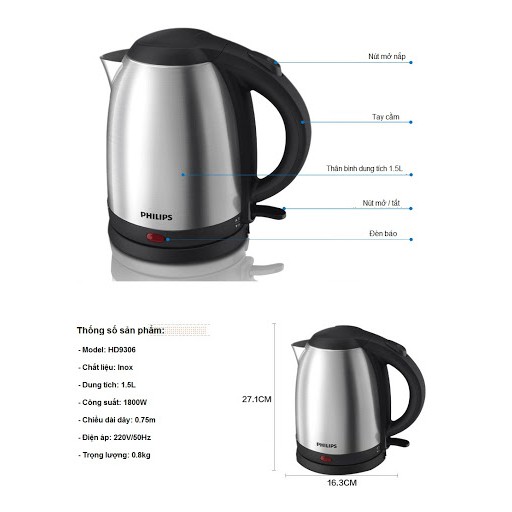 Thông số kỹ thuật Bình đun siêu tốc Philips 1.5 lít HD9306Đặc điểm sản phẩm