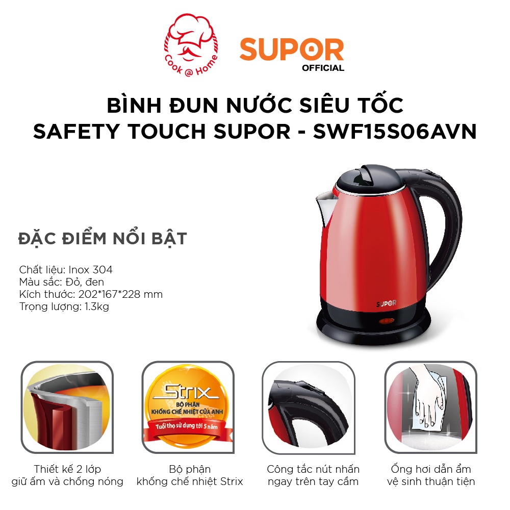 -Bình Đun Siêu Tốc Hai Lớp Inox 304 SUPOR SWF15S06AVN - 1.5L (Đỏ Đen) sẽ giúp bạn và người thân có được nước sôi để sử dụng một cách nhanh chóng nhất.