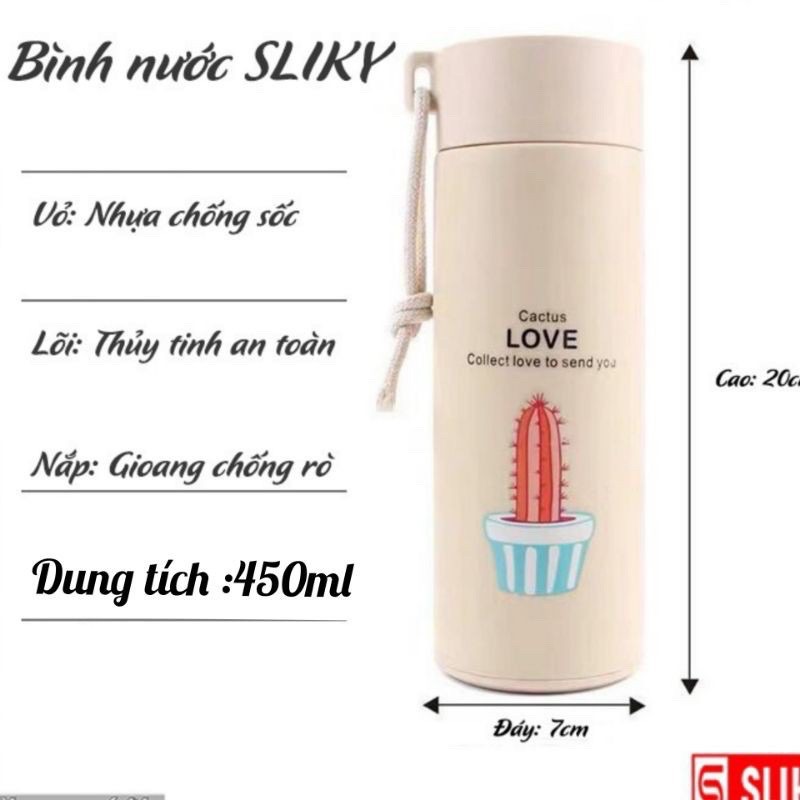 Giới thiệu Bình đựng nước lõi thủy tinh họa tiết xương rồng dễ thương dung tích 450ml