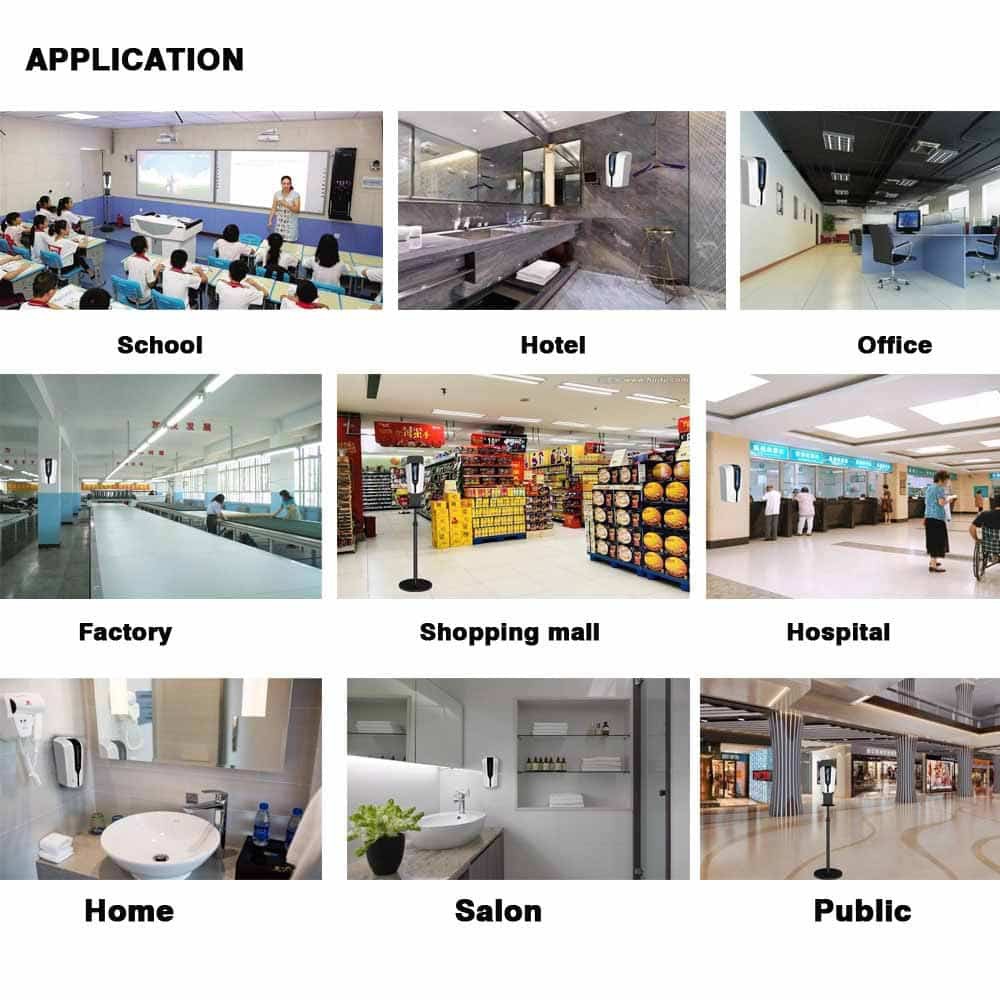 Phù hợp với nhiều nơi như nhà ở, bệnh viện, khách sạn, văn phòng, nhà máy, xí nghiệp,... Máy có thể gắn với chân dễ dàng di chuyển mọi nơi như cổng vào, khuôn viên, bàn tiếp tân,...Hai kiểu đầu phun có sẵn cho khách hàng tùy chọn phù hợp: Phun bọt, phun nhỏ giọt.