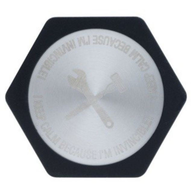 1. Bình giữ nhiệt có phần nắp có hình ảnh dụng cụ và chữ " I KEEP CALM because I'M INVINCIBLE " tạo cảm giác mạnh mẽ, nam tính