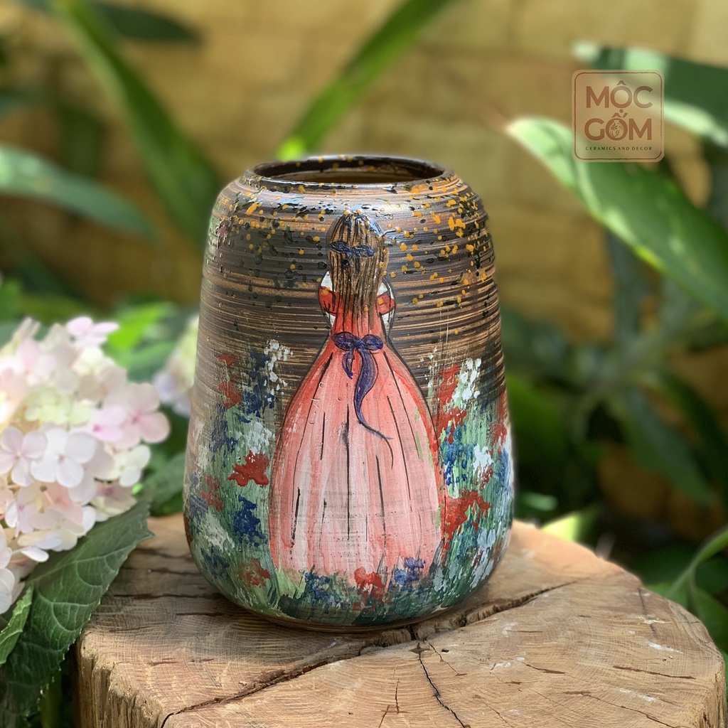GIỚI THIỆUBóng dáng "nàng thơ" được tô điểm trên nền gốm men mộc bình yên và thơ mộng ... được vẽ tay hoàn toàn bởi các nghệ nhân làng gốm Bát Tràng tạo nên một siêu phẩm Bình hoa cô gái gốm Bát Tràng xinh xắn decor, lọ sứ cắm hoa trang trí để bàn với dáng thang đầm chắc chắn , và men mộc tone nâu trầm hòa , cực Tây . Phù hợp để cắm mọi loại hoa từ hoa hồng , họa mi , tú cầu ,hoa phăng ...
