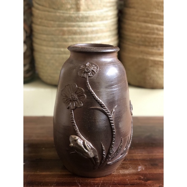 Bình hoa gốm sành thủ công, hàng vuốt tay không tráng men.Bình hoa văn 2 mặt, cao 27cm miệng 10cm.