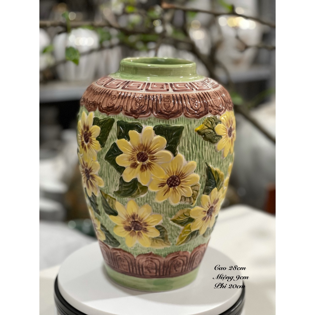 Bình hoa gốm sứ dáng vò đắp hoa nổi Bát TràngCao 28cm, Miệng lọ 9cm, đường kính 20cm