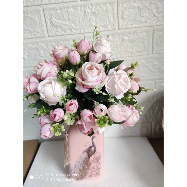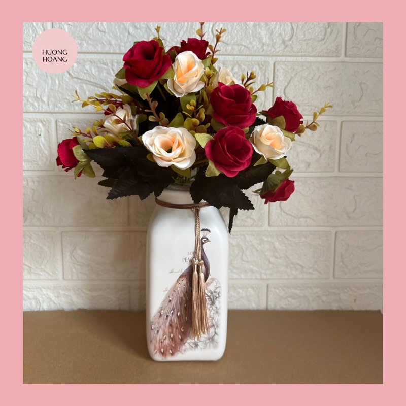 - sản phẩm bao gồm 1 bình cắm hoa hình con công có dây quấn cổ như hình kèm 05 chùm hoa hồng giả, đã cắm sẵn khách chỉ việc trưng kệ .- Dùng để kệ, bàn ăn, bàn làm việc, trưng phòng khác; làm quà tặng quà biếu đều đẹp