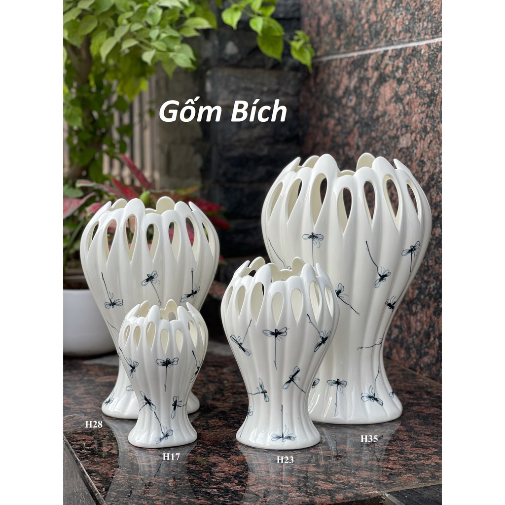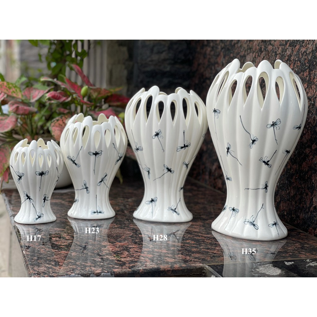 Bình Hoa Lọ Hoa Bàn Tay Phật Men Kem Vẽ Chuồn Kim Full Size - Gốm Sứ Bát Tràng Cao Cấp
