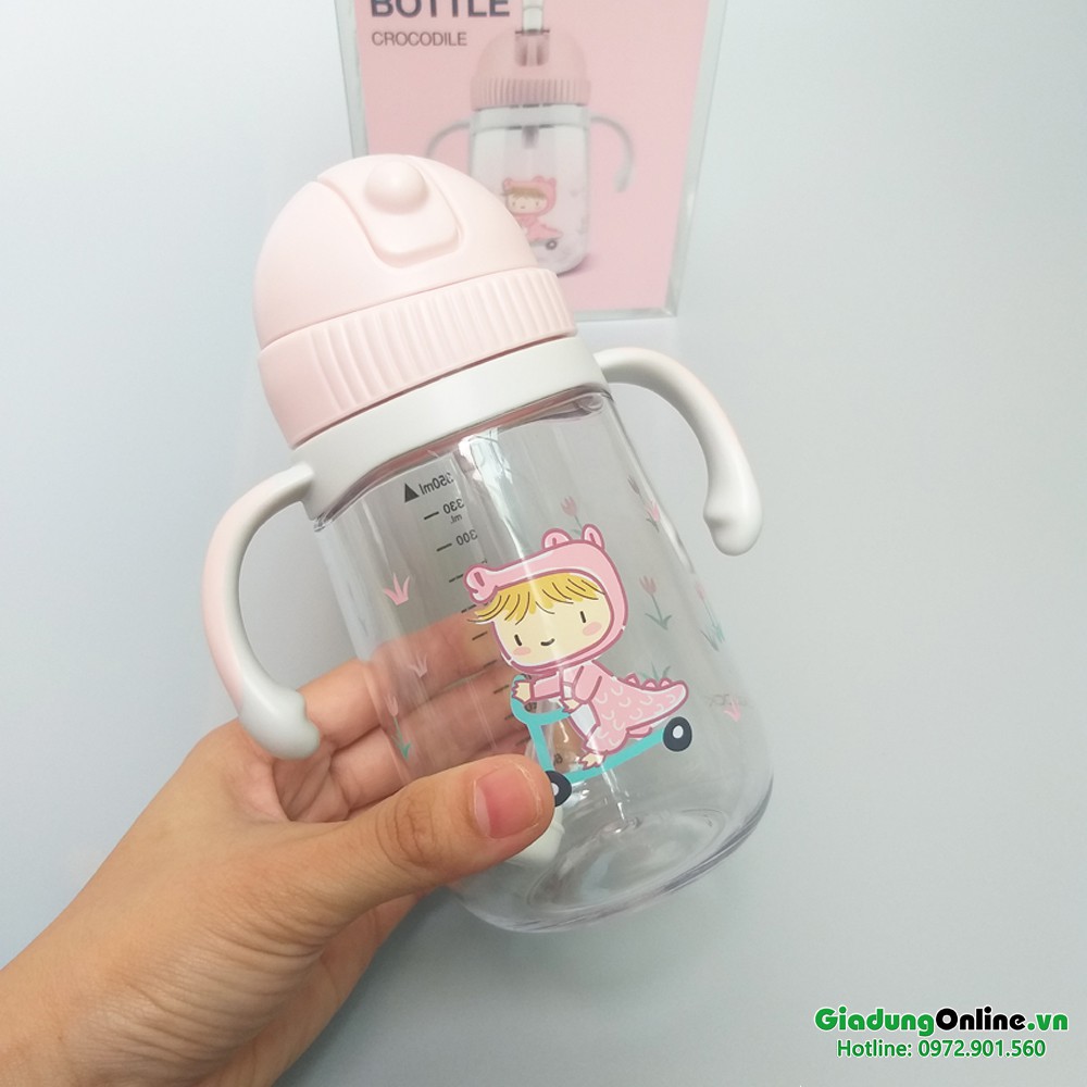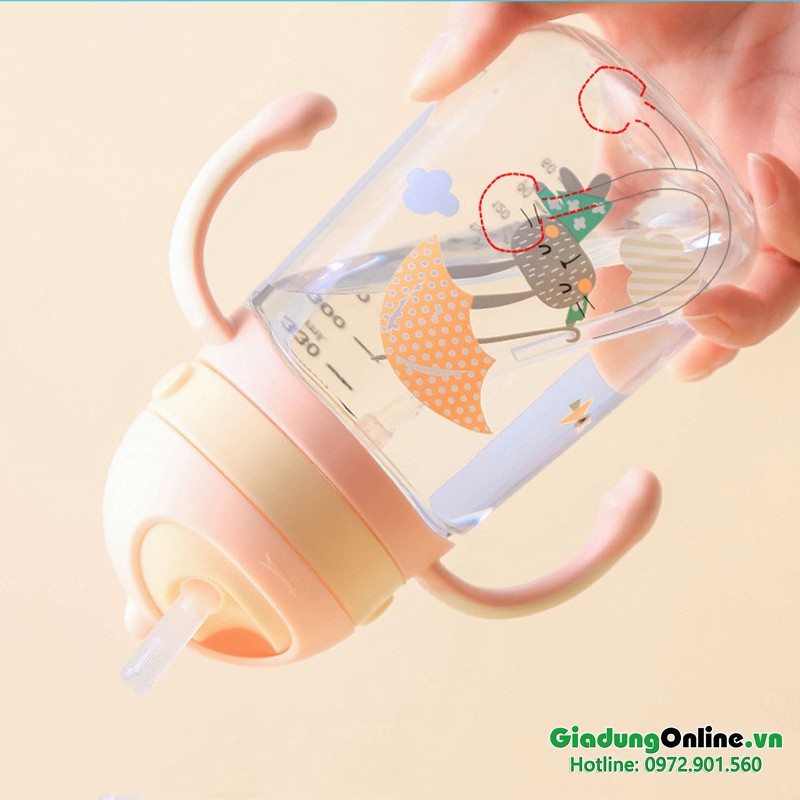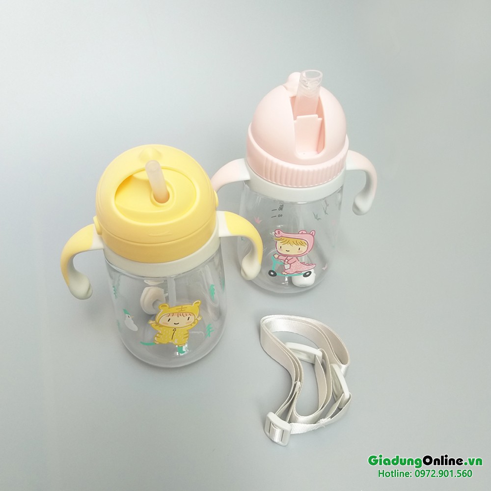 * Bình có ống hút, có tay cầm giúp bé tự cầm uống dễ dàng. Có thể tháo 2 tay cầm bình và nắp dây đeo khi bé mang bình ra ngoài rất tiện lợi.