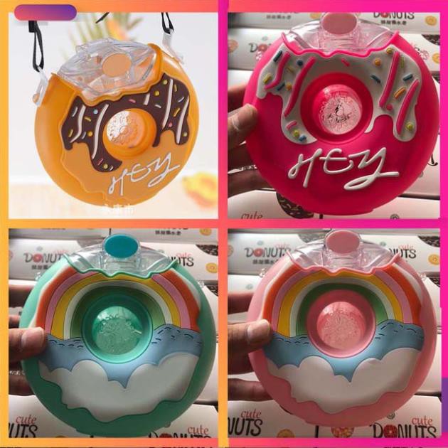 Bình nước bánh donut 380ml dành cho trẻ em, có kèm ống hút và dây đeo cổ xinh xắn, có nhiều màu và hình thú dễ thương.🌈 Hình: Peppa | màu vàng cam | cầu vòng xanh | cầu vòng hồng | xanh ngọc | hồng cánh sen | doremon