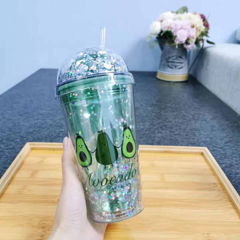 Bình Nước Nhựa pilu Họa Tiết Quả Bơ có ống hút đựng nước khi đi học, đi làm hình cốc nước
