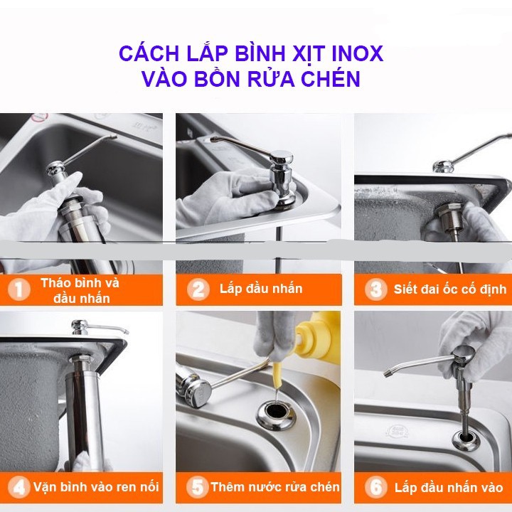 Bình Nước Rửa Chén 100% INOX Bình Xà Bông Nhấn Hơi Âm Thành Chậu, hết nước rửa chén chỉ cần rút cái đầu ra rồi thêm vào
