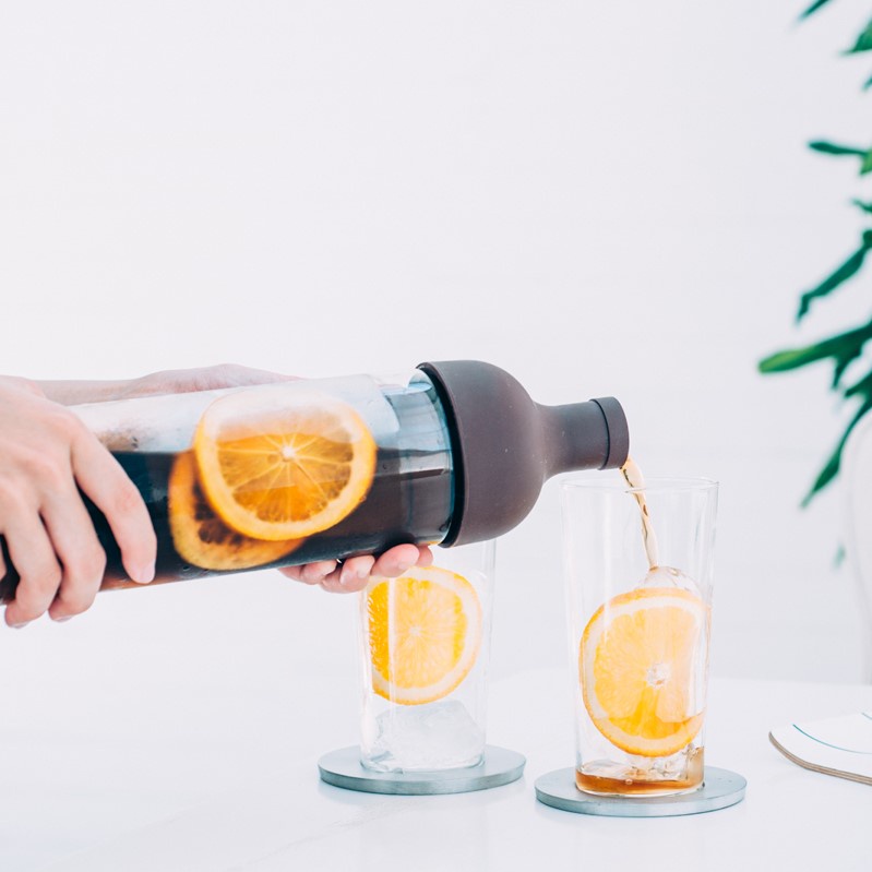 Dùng pha cà phê ủ lạnh Cold brew: Cho khoảng 55g cà phê vào lưới lọc, gắn khung nối vào, đậy nắp silicon lên phía trên, nhẹ nhàng rót nước vào đầy bình, rồi đậy nút silicon lại, lắc nhẹ bình qua trái, phải để nước thấm đều vào cà phê. Cho vào ngăn mát tủ lạnh khoảng 8 tiếng, sau đó lấy ra thưởng thức. Nên dùng hết cà phê càng sớm càng tốt.