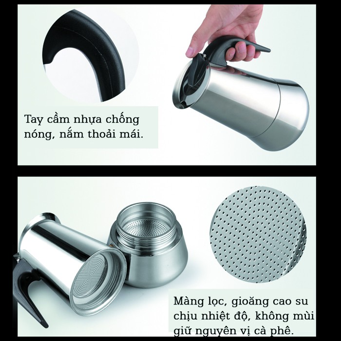 Tuy cà phê chưa thể giống 100% với Espresso tạo ra từ máy chuyên dụng nhưng cũng đủ thoả mãn nhu cầu của mình. Bởi lẽ, bình Moka tiện dụng, linh động và đặc biệt là chi phí rất hợp lý. Phần tay cầm và núm mở ấm sử dụng nhựa cách nhiệt tốt, không gây bỏng tay. Ngoài ra, các bộ phận của ấm pha cà phê có thể tháo rời dễ dàng vệ sinh.