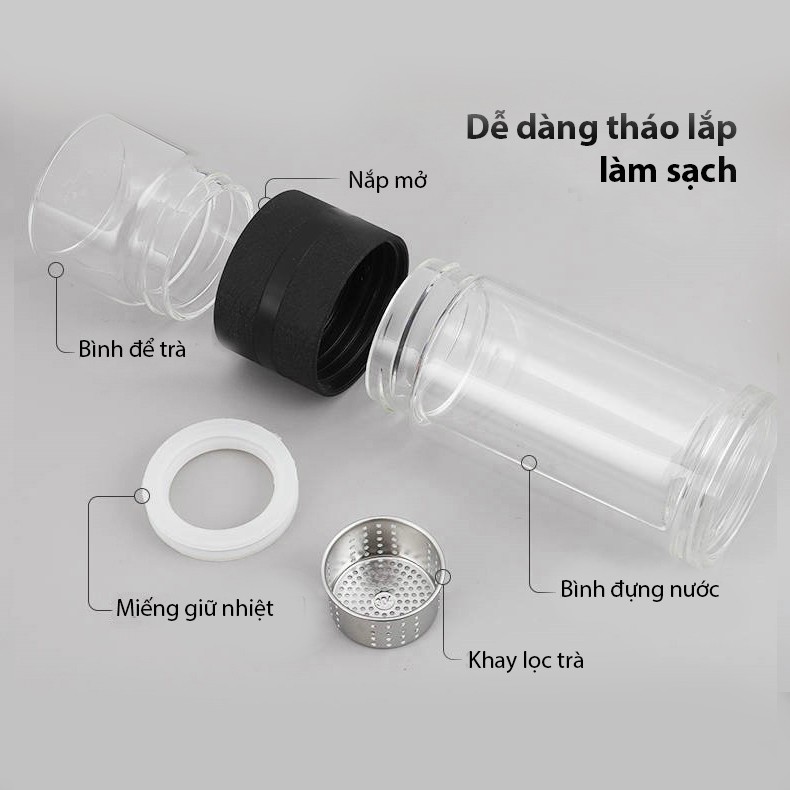 Bình pha trà thủy tinh 2 lớp với thiết kết cao cấp có dây sách tiện lợi. Bình có nắp, cốc để trà, ngăn giữa là miếng lọc inox 304 không rỉ giúp người dùng thoải mái sử dụng. Các bộ phận có thể dễ dàng tháo dời vệ sinh sau khi sử dụng. Đặc biệt bình nước có lớp thủy tinh 2 lớp chịu nhiệt cao vừa có chức năng giữ nhiệt không bị nóng tay khi cho nước sôi.