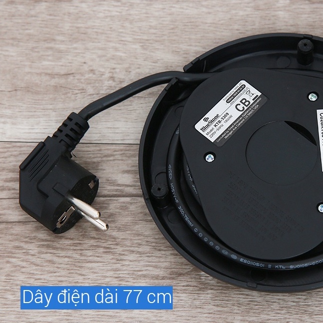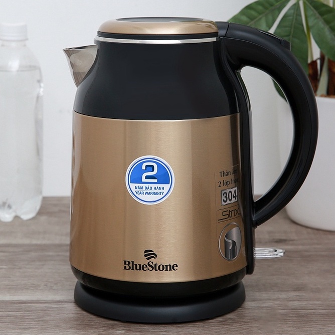 - Bình đun siêu tốc Bluestone màu đen vàng đồng sáng bóng, sang trọng, bắt mắt, tăng tính thẩm mỹ cho mọi gian bếp hiện đại- Mâm nhiệt bình đun siêu tốc phẳng, công suất 1800 W, truyền nhiệt tốt, đun nước mau sôi chỉ trong 5 - 7 phút
