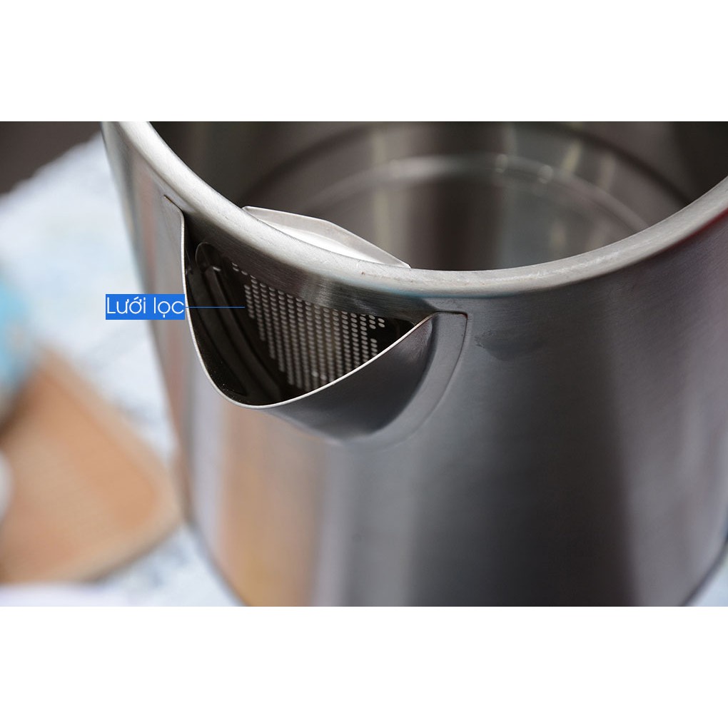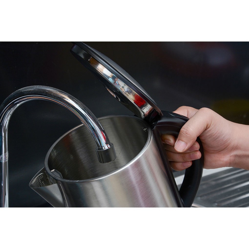Đèn phát sáng khi bình đang đun nước và tắt khi bình đã đun xong, giúp bạn theo dõi quá trình đun nước một cách dễ dàng. Bên cạnh đó, miệng bình đun rộng và có thiết kế nắp đậy dễ mở rất thuận tiện cho người dùng khi châm nước vào để đun sôi, bạn có thể rót nước trực tiếp từ vòi vào bình đun rất tiện lợi. Lưới lọc cặn trên miệng vòi giúp lọc nước sạch sẽ, tinh khiết, không lẫn tạp chất, an toàn hơn
