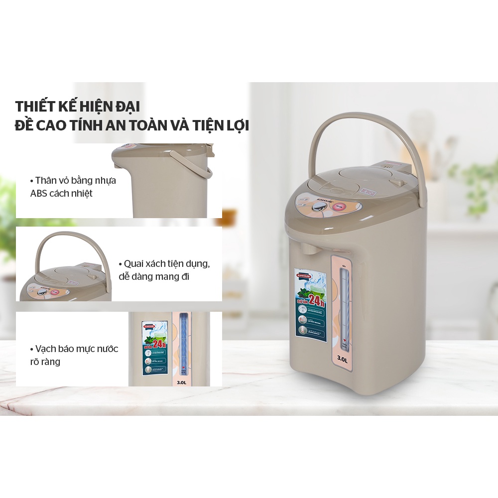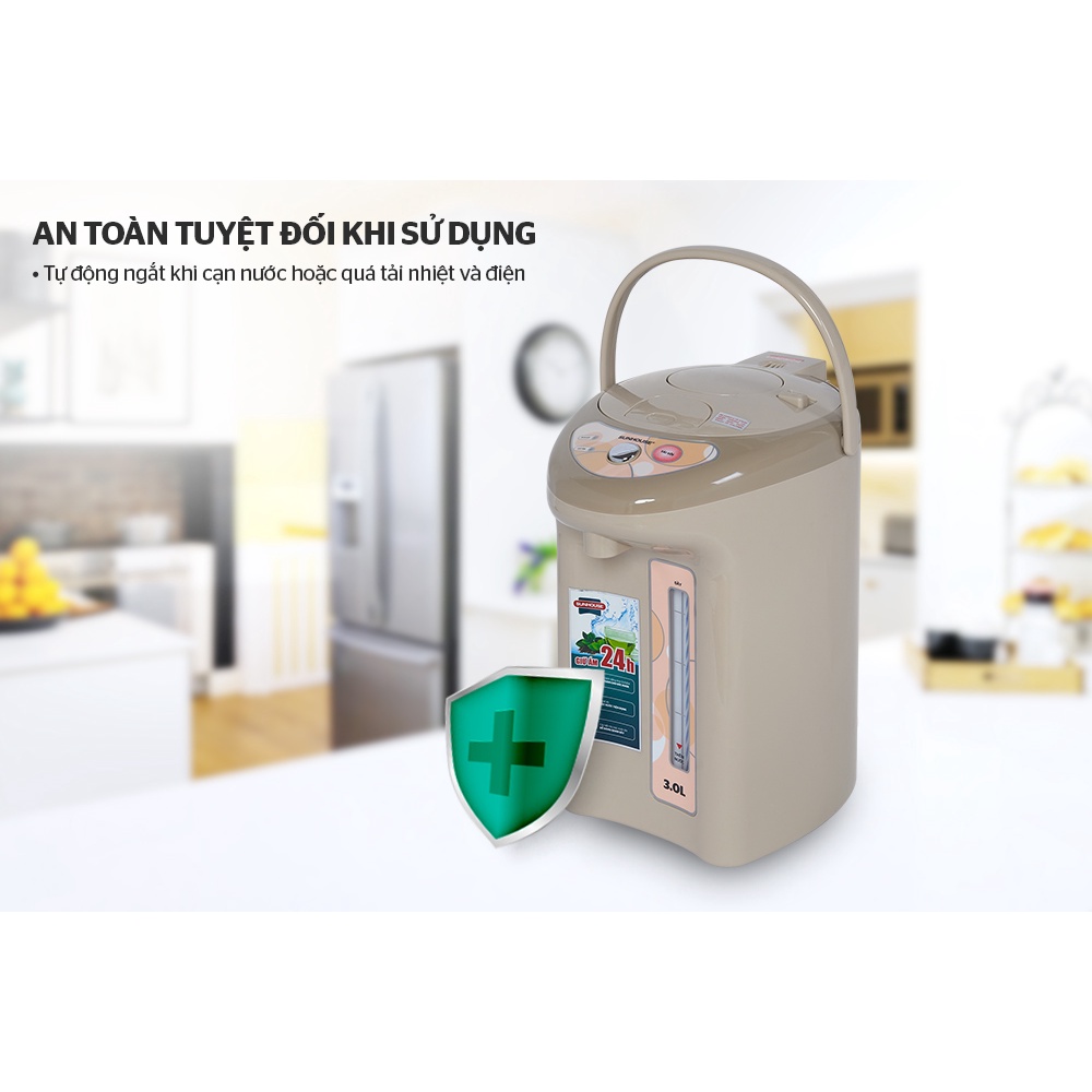 Dung tích 3L thích hợp sử dụng trong gia đình đông người hoặc văn phòng đảm bảo nước sôi để pha trà, cafe hay úp mì, cháo ăn liền...