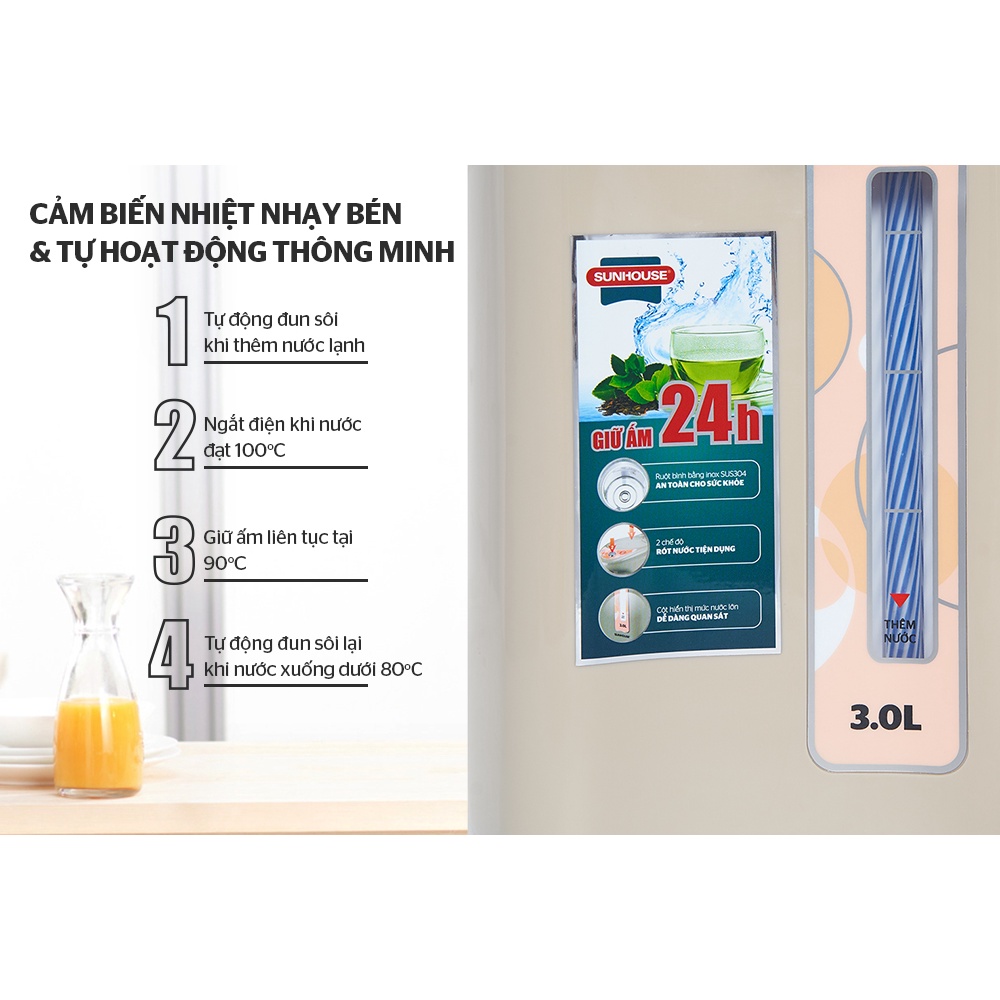 Bình thủy 3.0 L SUNHOUSE SH1530 có chức năng giữ ấm ở nhiệt độ lên đến 90 độ C giúp duy trì nước nóng liên tục trong bình. Ngoài ra, bình còn có chức năng tự động đun sôi 100 độ C khi châm thêm nước lạnh vào bình.