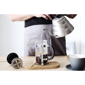 Đun đủ nước sôi để pha cà phê với bình French Press. Trước khi cho cà phê vào bình nên tráng bình bằng nước sôi để bình ấm hơn, cà phê giữ nóng sẽ lâu hơn.